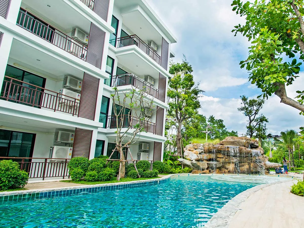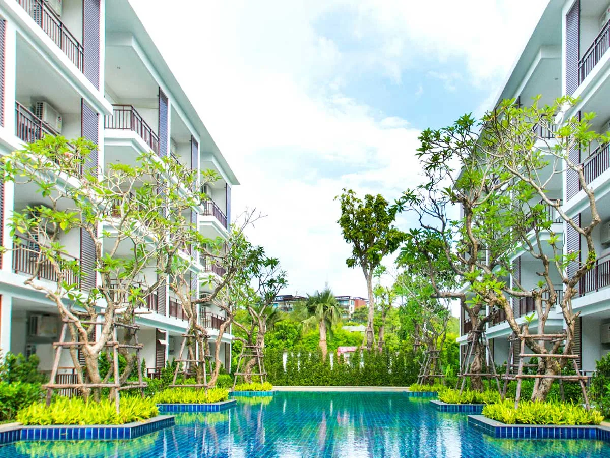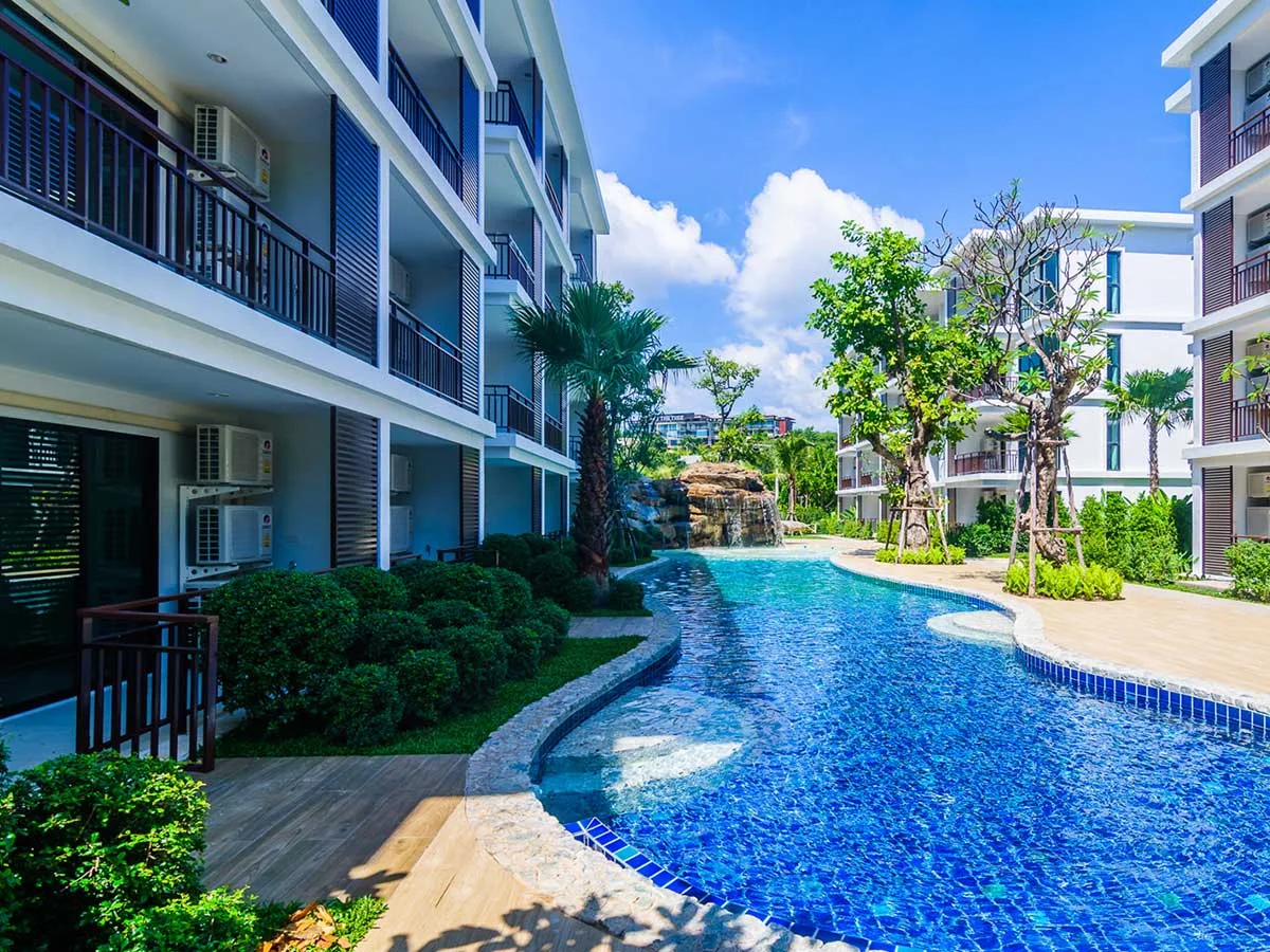 Designed with attention to detail, well thought out and fully utilized, The Title Condiminium offers the large common area with ripple bright blue swimming pools, walkways, and fitness surrounded by tropical jungle.